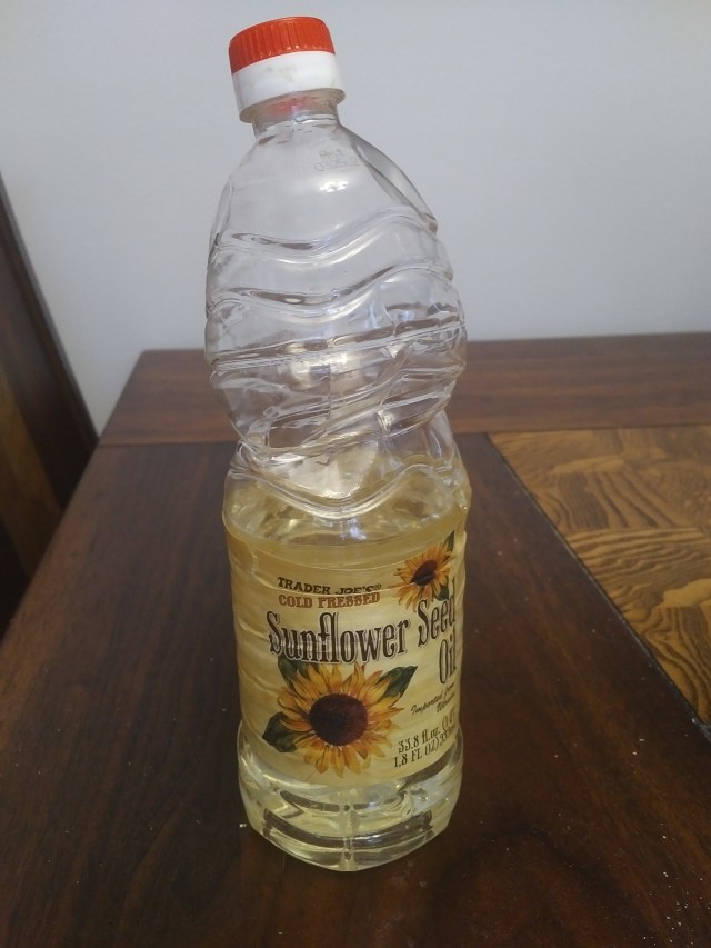 My hilariously crumpled bottle of sunflower seed oil. (It’s the only way it’ll fit in the cupboard!)